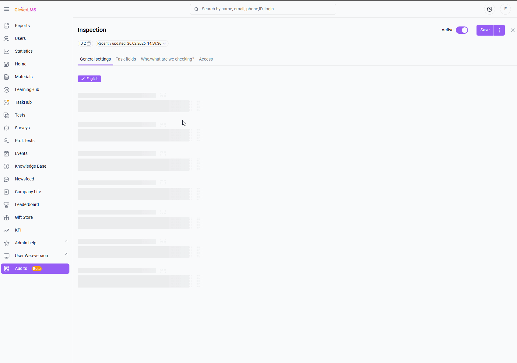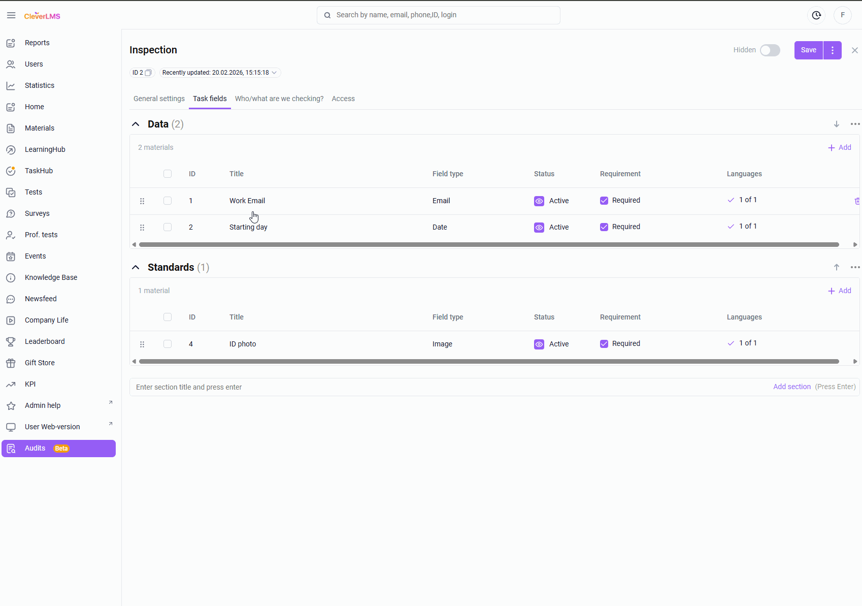 The status switch in the Audit header, Hidden or Active, indicates the availability of the task in the platform – whether it is displayed in the user interface or not.