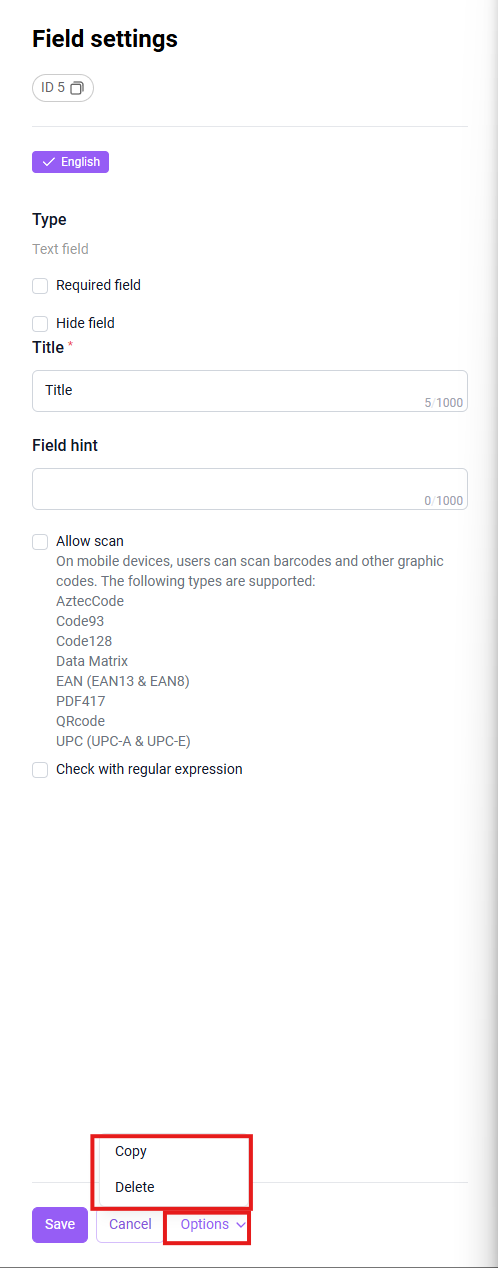 - The Allow Scanning checkbox (appears for all field types except Date, File, Image , and Multiple Selection ) allows you to scan a barcode or other graphic code on mobile devices. This will be added in future updates.