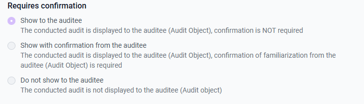 - Show to the auditee (selected by default) – the conducted audit is displayed to the auditee; confirmation of the audit results is not required;