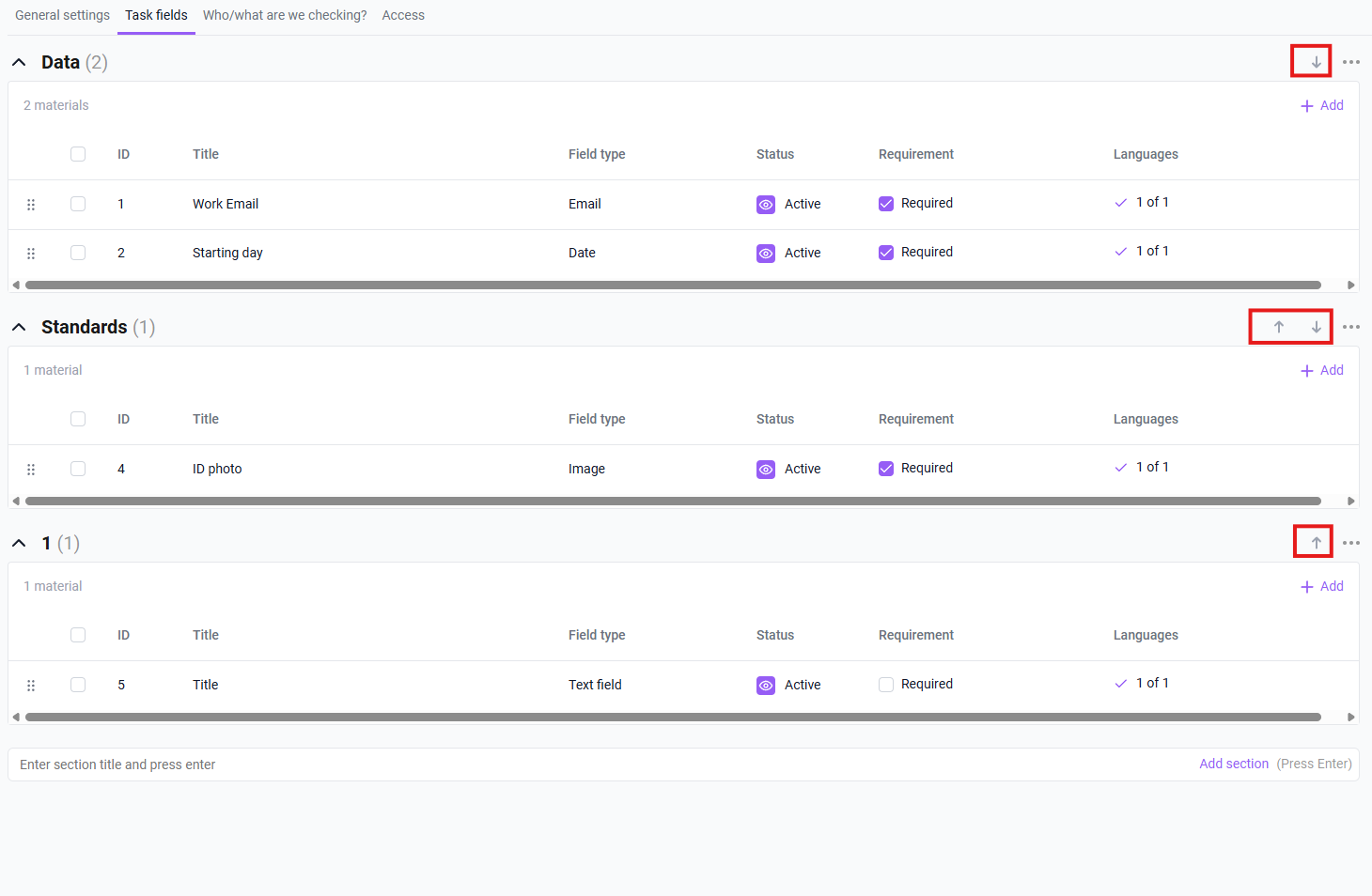Created sections can be rearranged by clicking the arrow in the upper right corner of the section. Clicking the three dots allows you to edit the section name or delete it entirely.