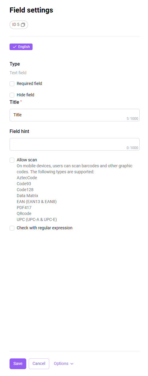 The following types are supported: AztecCode, Code93, Code128, Data Matrix, EAN (EAN13 and EAN8), PDF417, QRcode, UPC (UPC-A and UPC-E); - The Validate input with a regular expression function is displayed for Numeric and Text fields and allows you to additionally validate user-entered data against a specified regular expression (max. 100 characters).