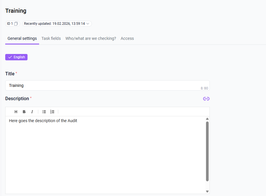 Once the audit has been created, you need to fill in its basic settings (required items are marked with * ):