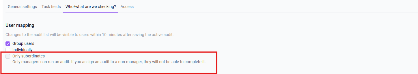 When the Only subordinates function is enabled, the checkboxes for selecting audit objects by group and individually become unavailable.
