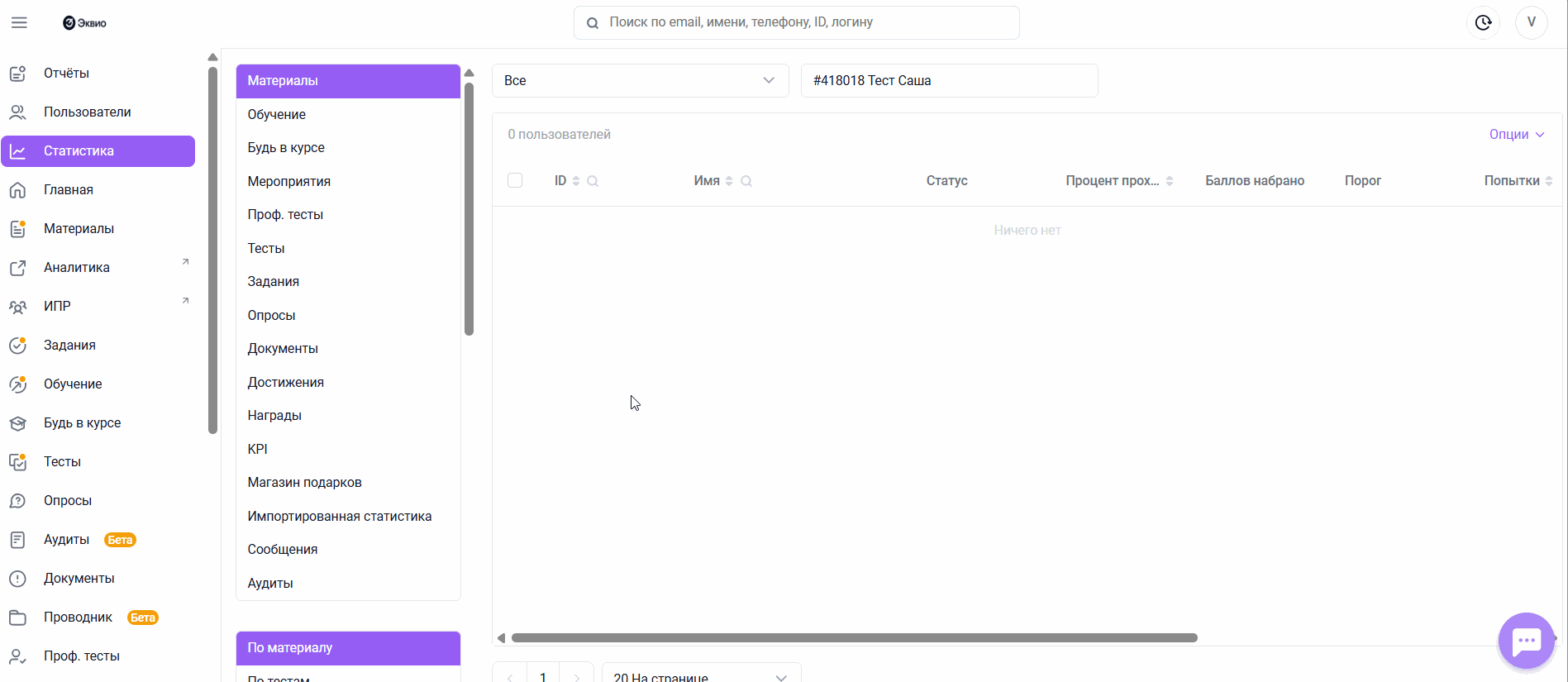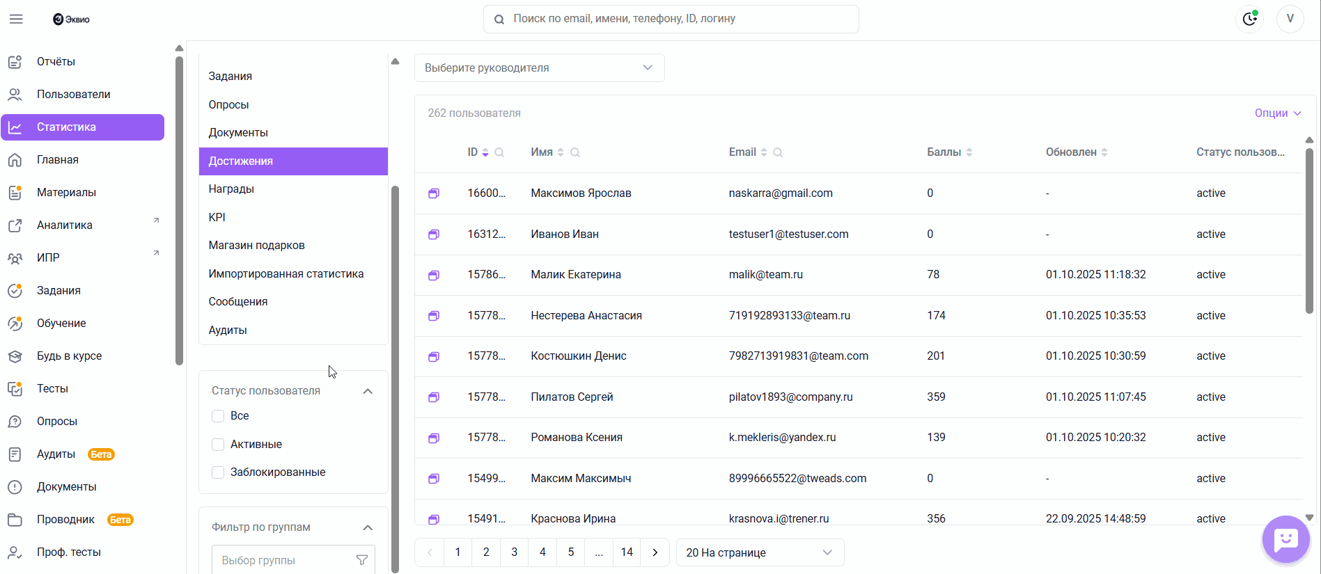 Для анализа активности пользователей и оценки их результатов в системе предусмотрена возможность просмотра и выгрузки статистики по модулю «Достижения». Это позволяет отслеживать количество набранных баллов, сравнивать показатели сотрудников и формировать отчетность для дальнейшей работы.