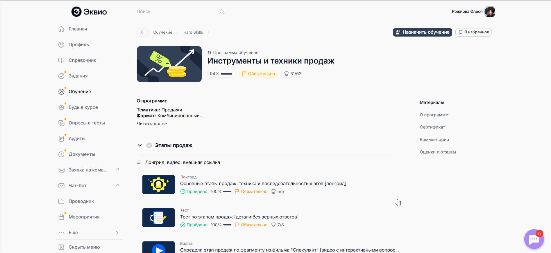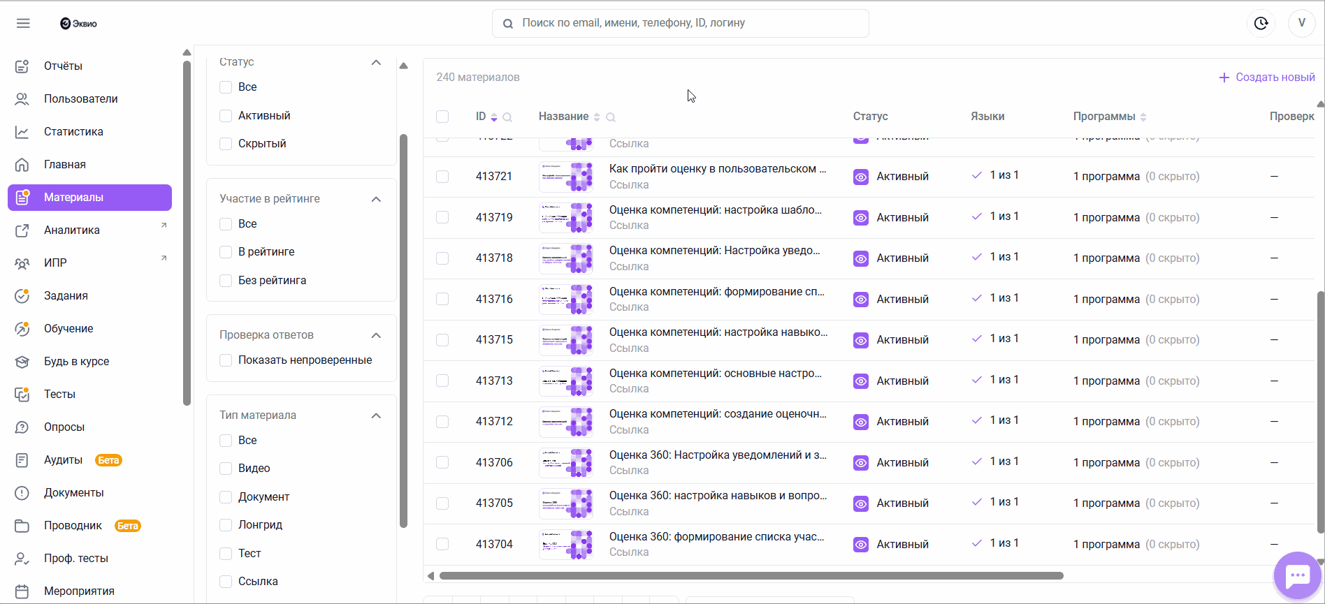 - Выберите нужный тест или создайте новый. При создании нового - сначала заполните основные настройки материала типа Тест;