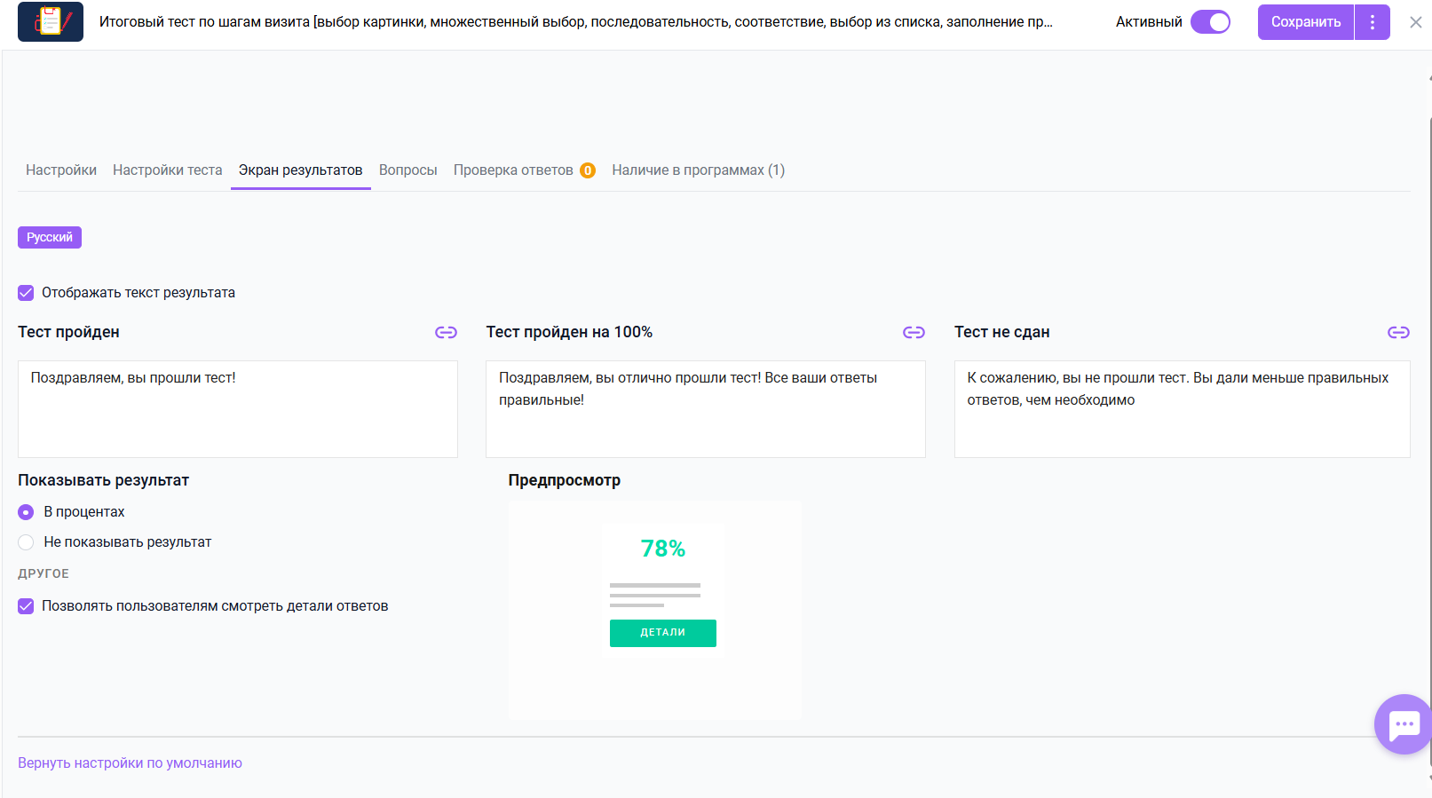Включите функцию Позволять пользователям смотреть детали ответов, если хотите, чтобы пользователи могли просматривать детали своих ответов после теста.