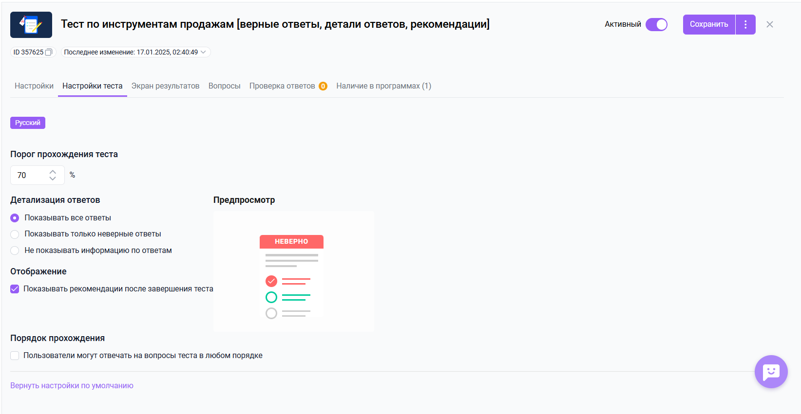 Укажите Порог прохождения теста - минимальный процент правильных ответов для прохождения теста (по умолчанию 70%). Значение по умолчанию может быть настроено суперадминистратором в модуле Обучение.