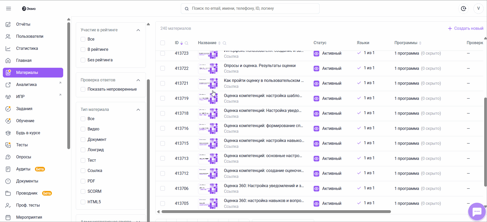 - Выберите нужный тест или создайте новый. При создании нового - сначала заполните основные настройки материала типа Тест;