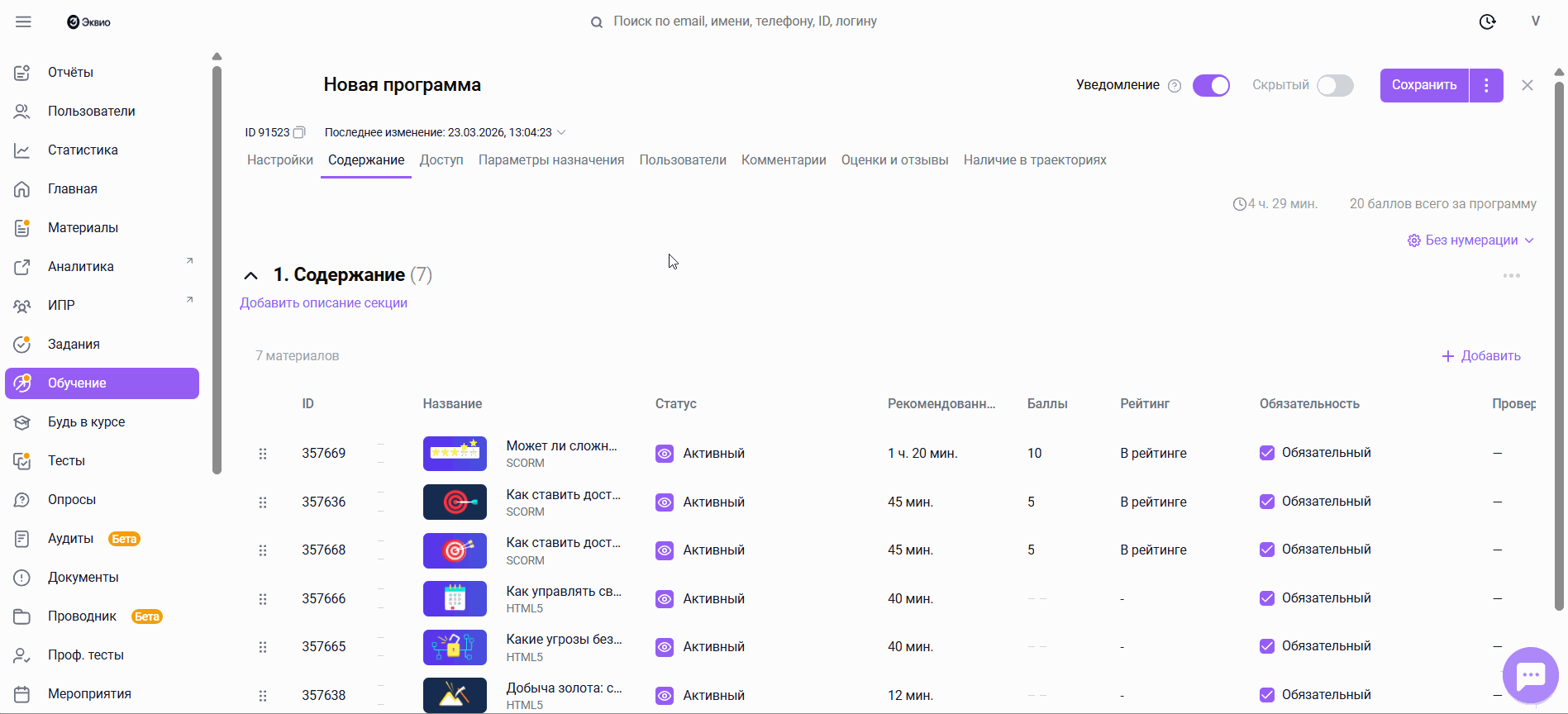 - Нажмите на кнопку Добавить в нужной секции программы обучения;