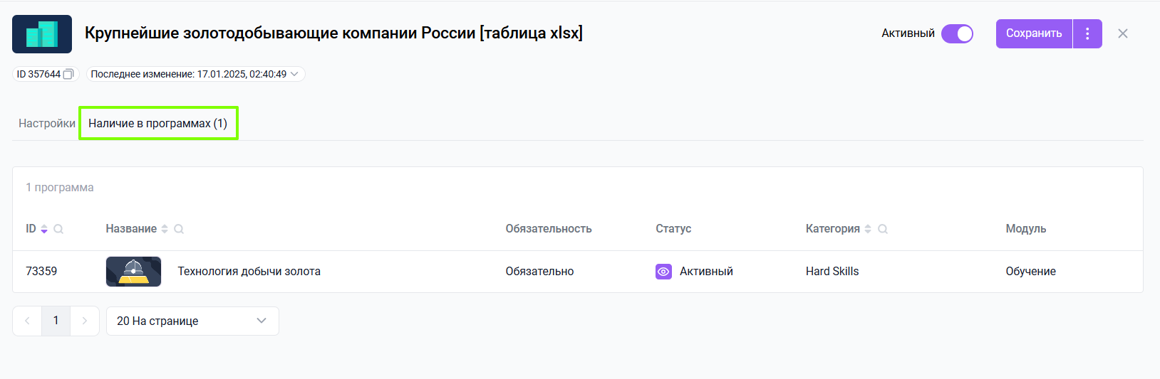 Во вкладке Наличие в программах в материале отобразится список программ, в которые материал будет добавлен.