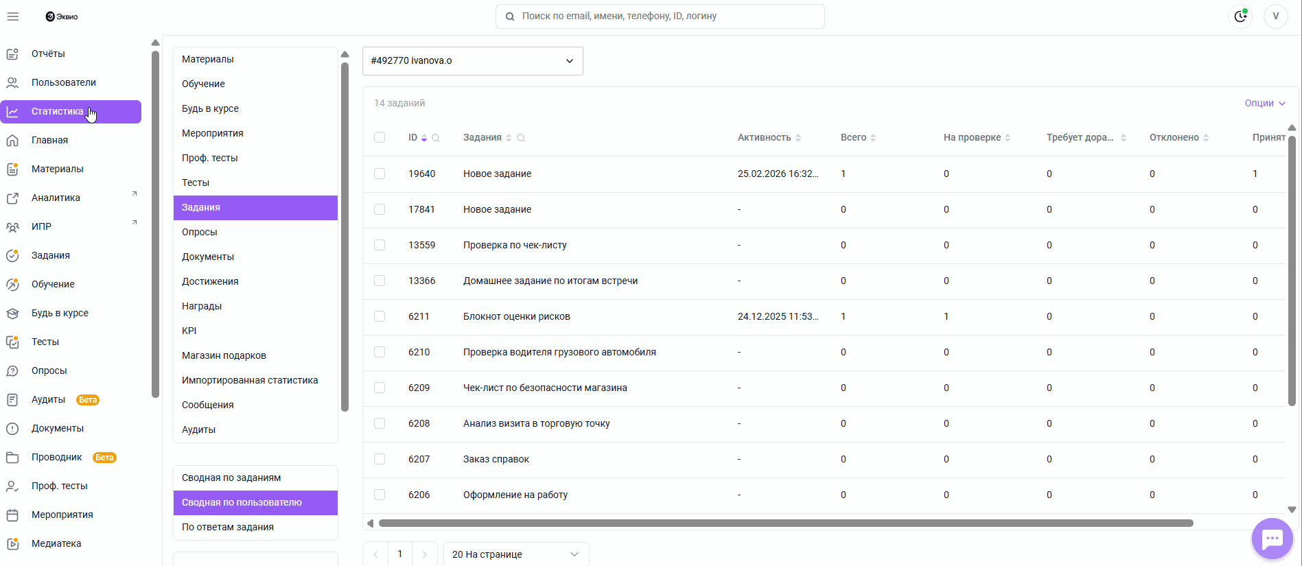 Тип статистики Сводная по пользователю показывает информацию по всем заданиям, которые выполнял выбранный сотрудник.