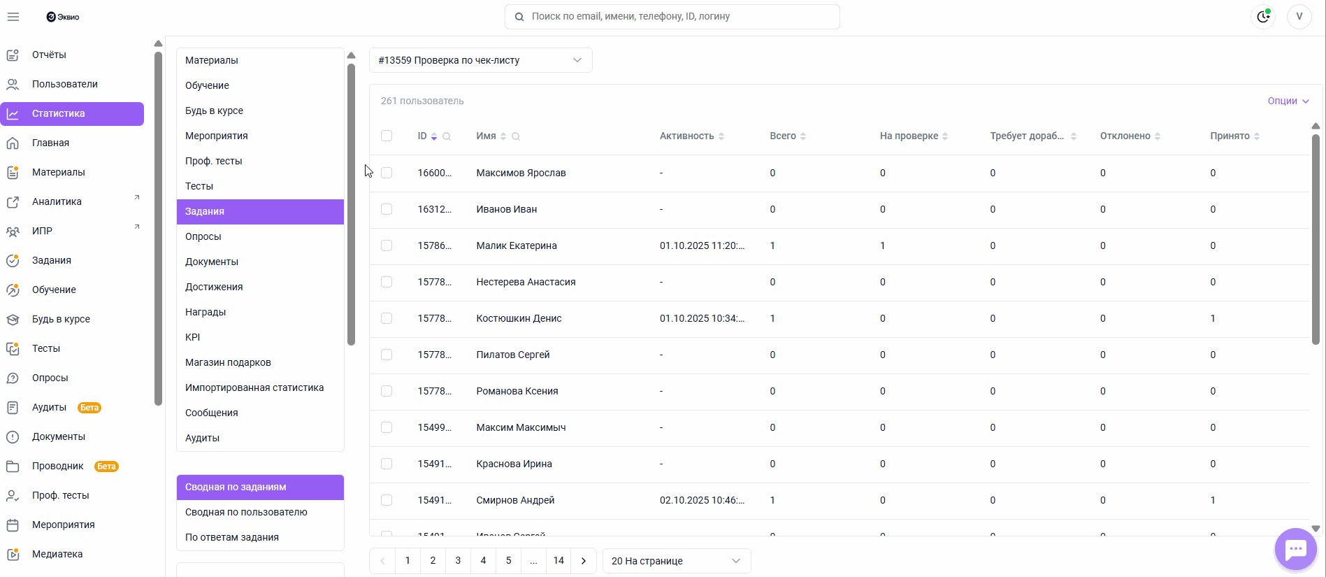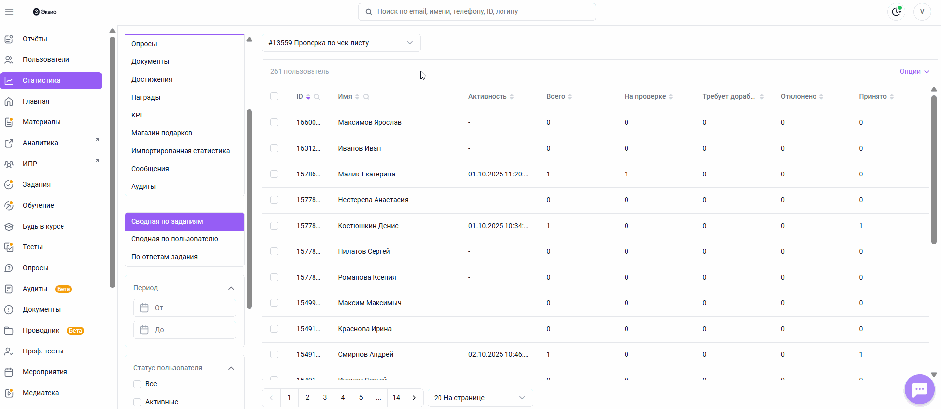 Раздел статистики по заданиям предназначен для анализа выполнения заданий пользователями. Он позволяет получить сводную информацию по заданиям, посмотреть статистику по конкретному пользователю или изучить детальные данные по каждому ответу.