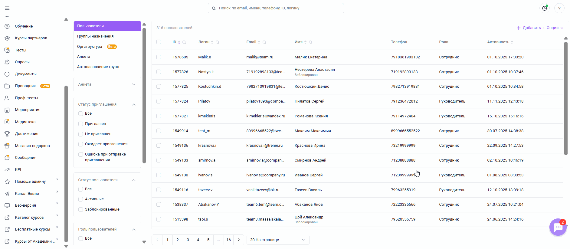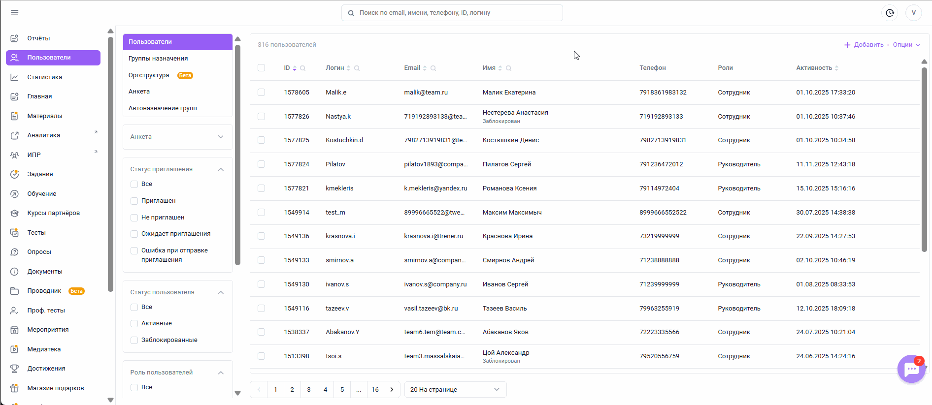 Вкладка "Пользователи" одноименного раздела служит для создания, редактирования, временной блокировки и удаления сотрудников с возможностью отслеживать их последнюю активность в системе, направлять приглашения с данными для входа и формировать команду из подчинённых для руководителей.
