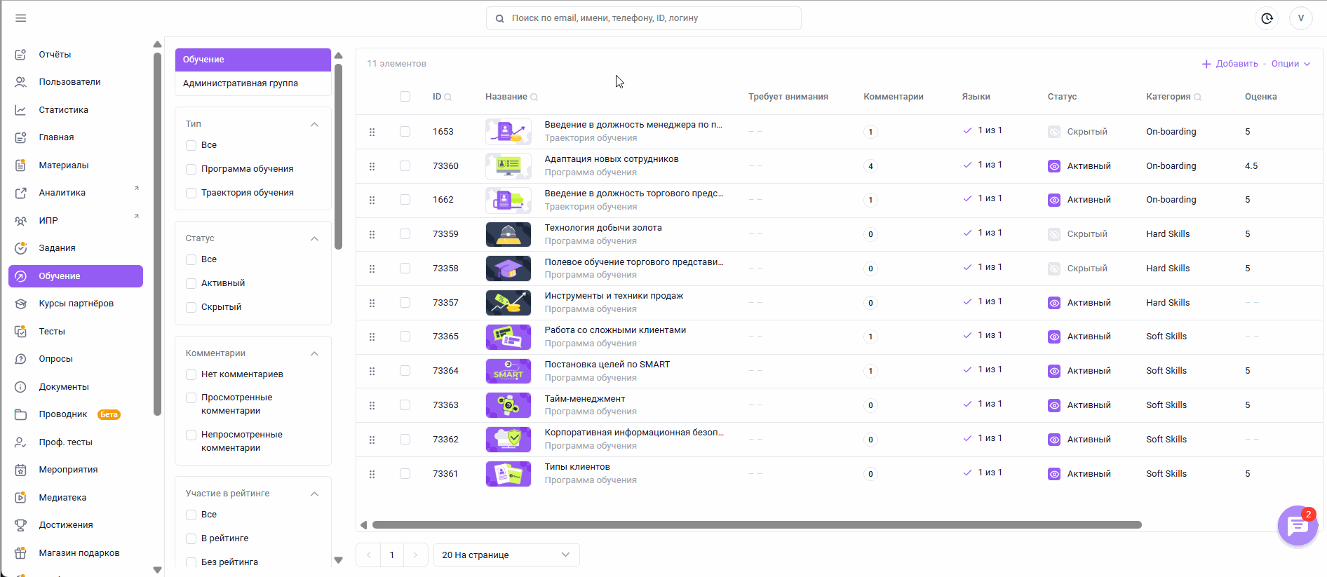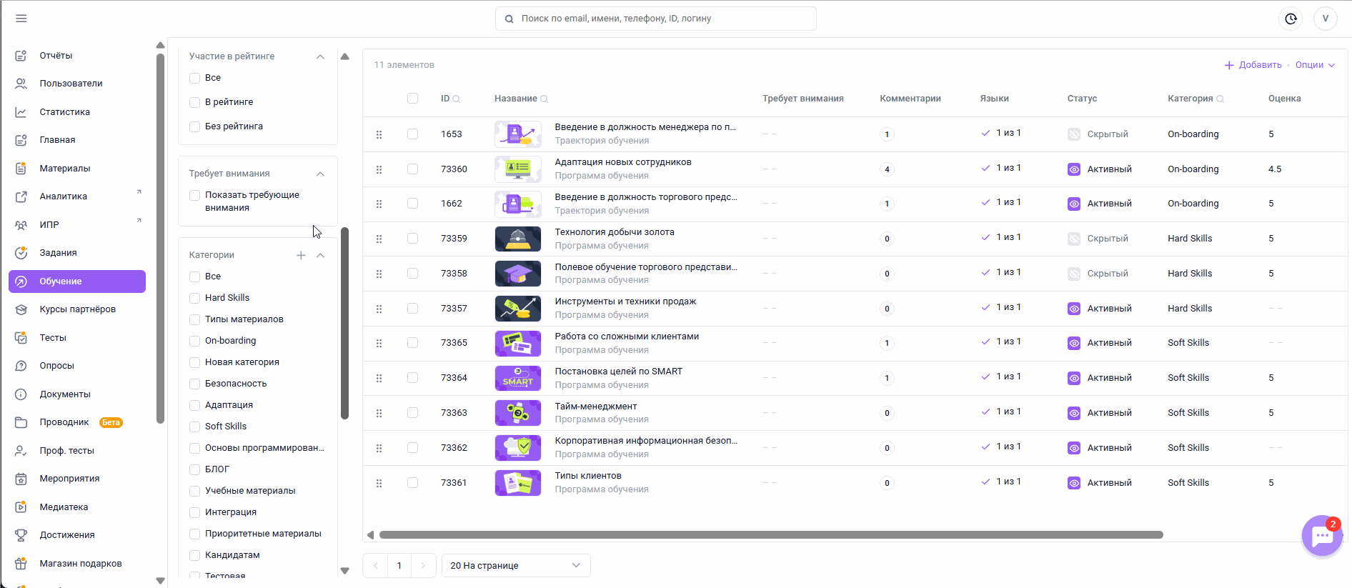 ОБУЧЕНИЕ - это раздел для создания пути развития сотрудника из обучающих материалов с заданной логикой прохождения. Раздел ОБУЧЕНИЕ тесно связан с разделом МАТЕРИАЛЫ . МАТЕРИАЛЫ - это банк, в котором хранятся документы, видео, лонгриды, ссылки, тесты и электронные курсы в формате SCORM и HTML5, их которых составляются Программы обучения и Траектории.
