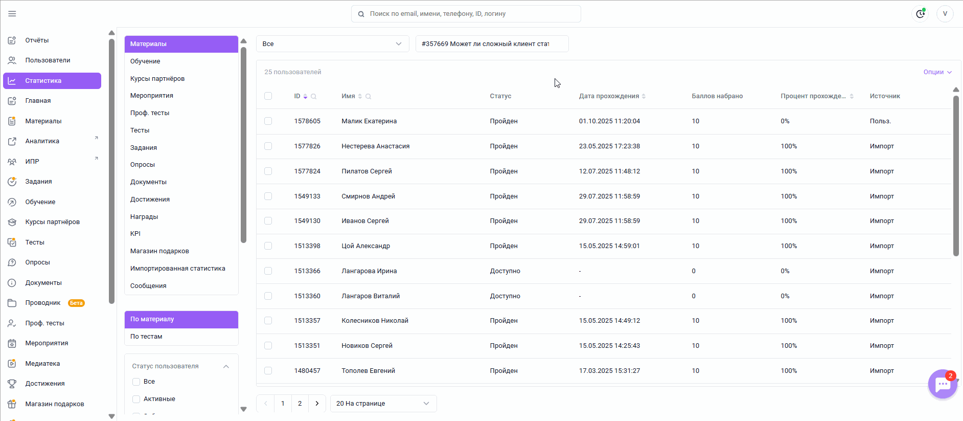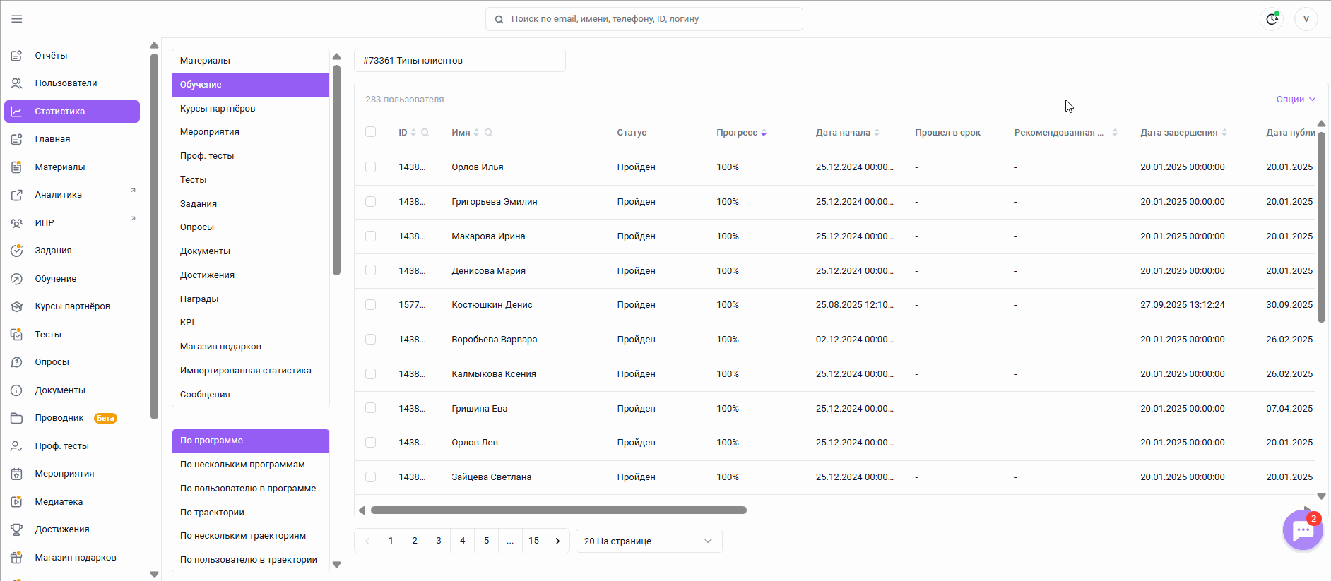 Для просмотра результатов обучения перейдите в раздел Статистика, выберите интересующий вас модуль (программы обучения/мероприятия/сообщения и др.) и детализацию (по программе/по пользователю и др.), найдите необходимый материал или пользователя. При необходимости воспользуйтесь фильтрами (по группам пользователей/статусу прохождения и др.) и сортировкой (по прогрессу/дате и др).