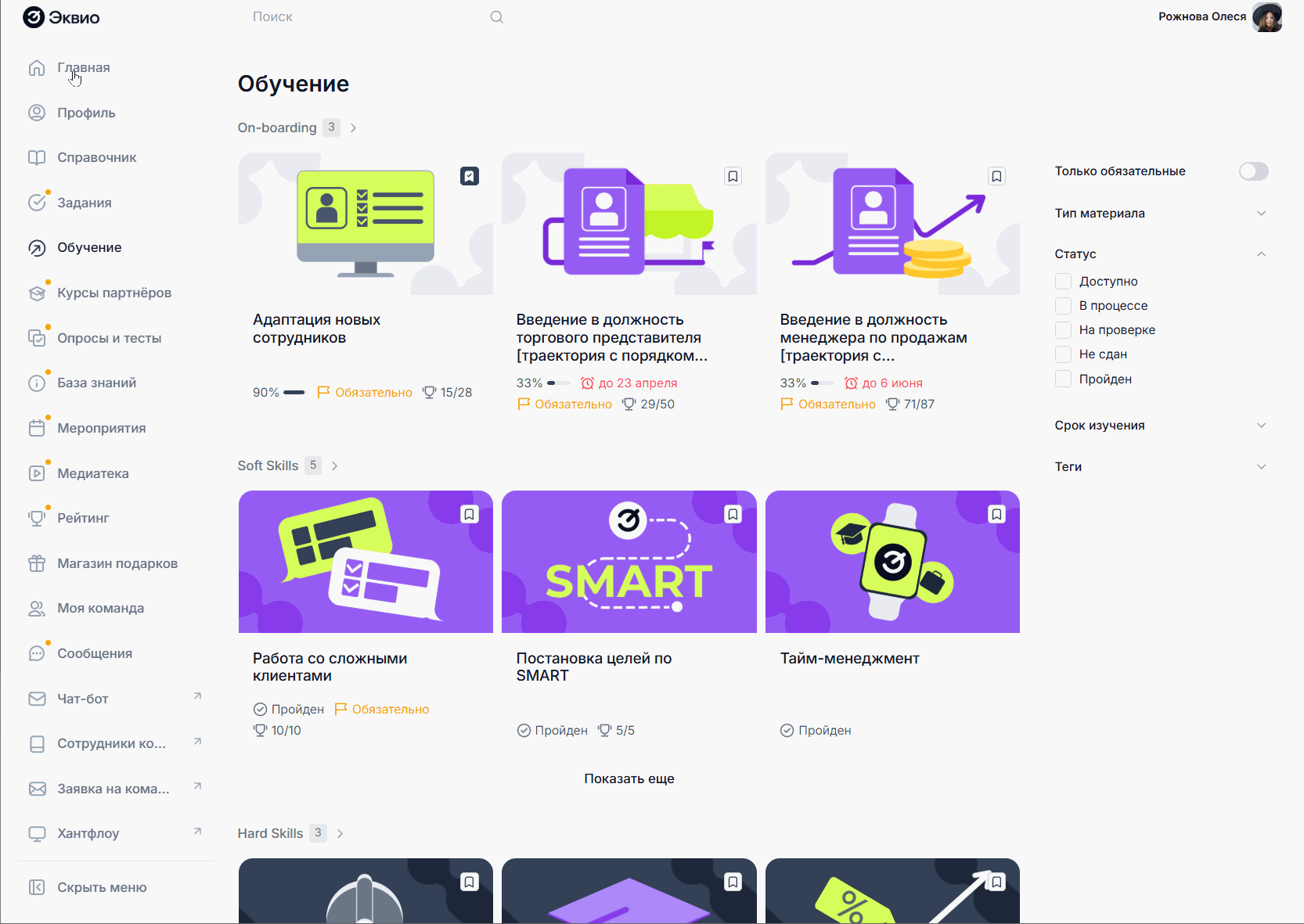 Также умный поиск позволяет находясь в любом разделе искать совпадения, содержащиеся в разделах "Обучение", "Мероприятия", "База знаний", "Сообщения", "Медиатека".