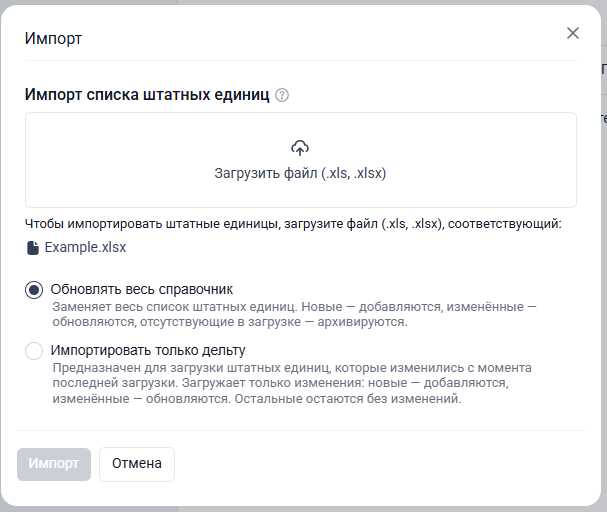 Импортировать только дельту - предназначена для загрузки штатных единиц, которые изменились с момента последней загрузки. Загружаются только изменения: новые — добавляются, изменённые — обновляются. Остальные остаются без изменений.
