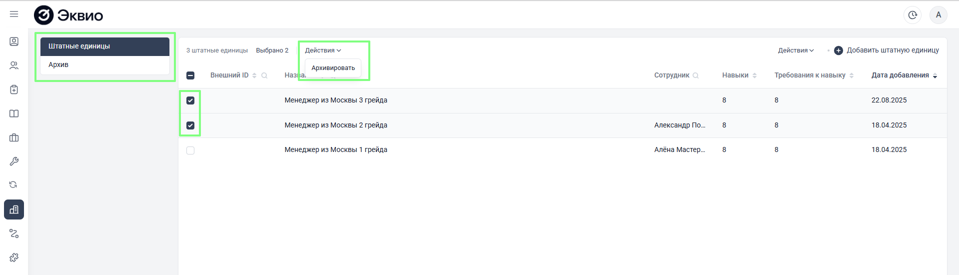 При необходимости можно отфильтровать и отсортировать их отображение, а также при помощи массовых действий перевести штатные единицы в архивный статус.