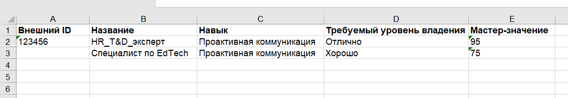 Заполнение файла для импорта навыков и требований для штатной единицы: