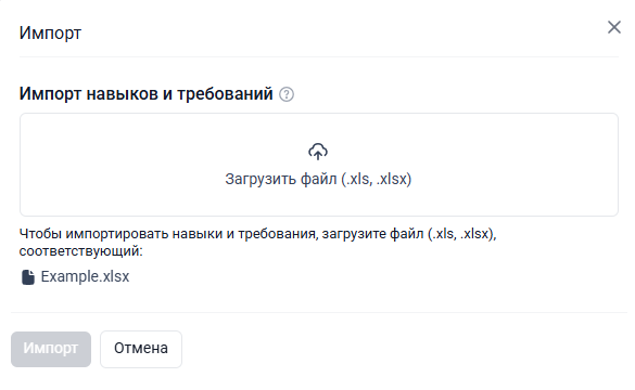 - В открывшемся окне скачать файл Example.xlsx и заполнить его данными по навыкам, и требованиям к ним в рамках штатных единиц;