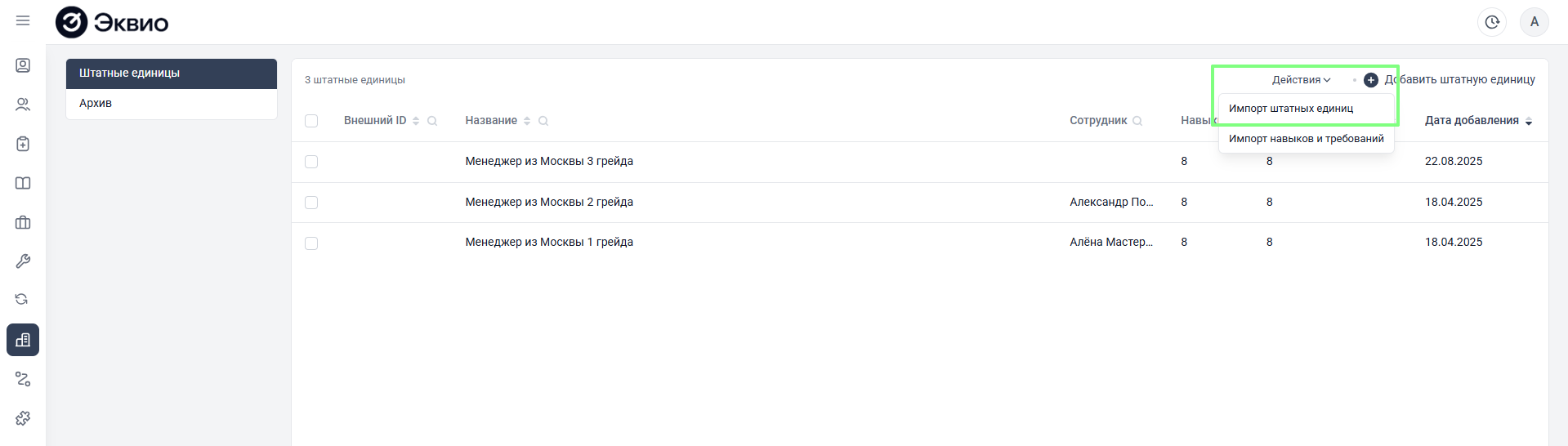 1. Нажмите "Действия" в правом верхнем углу экрана и выберите "Импорт штатных единиц";