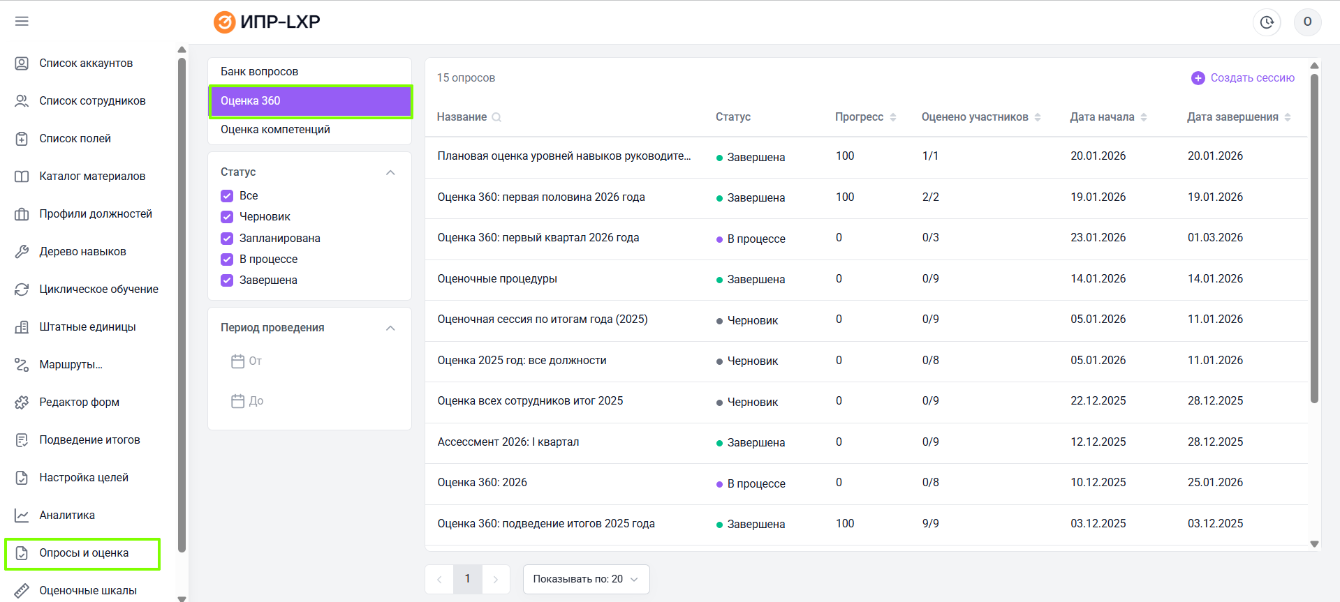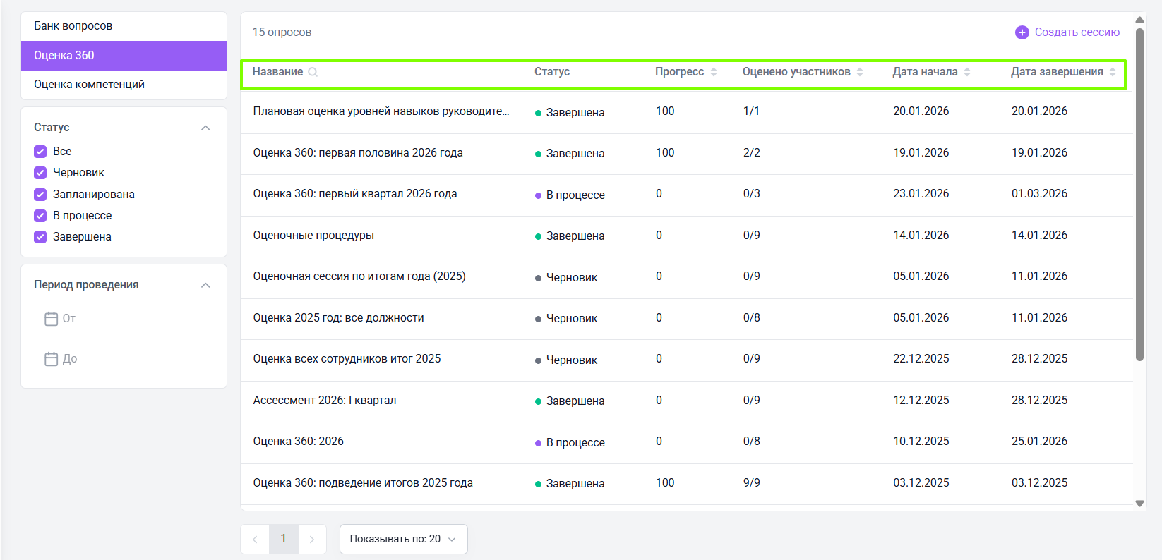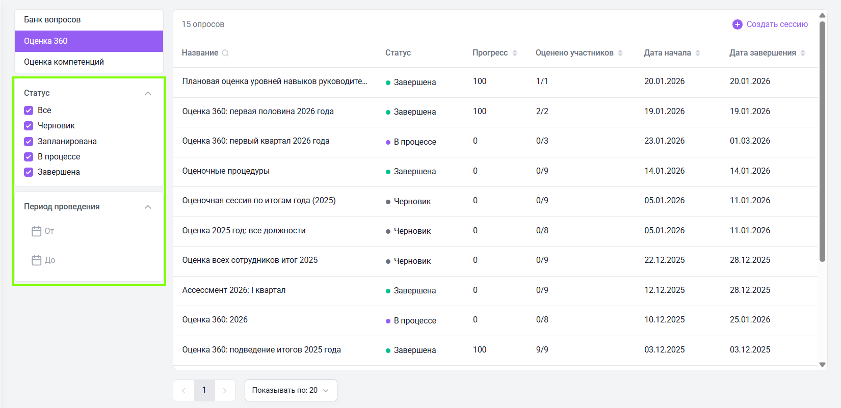 Слева от основной таблицы располагаются фильтры, позволяющие настроить ее отображение по статусу оценочной сессии и периоду ее проведения.