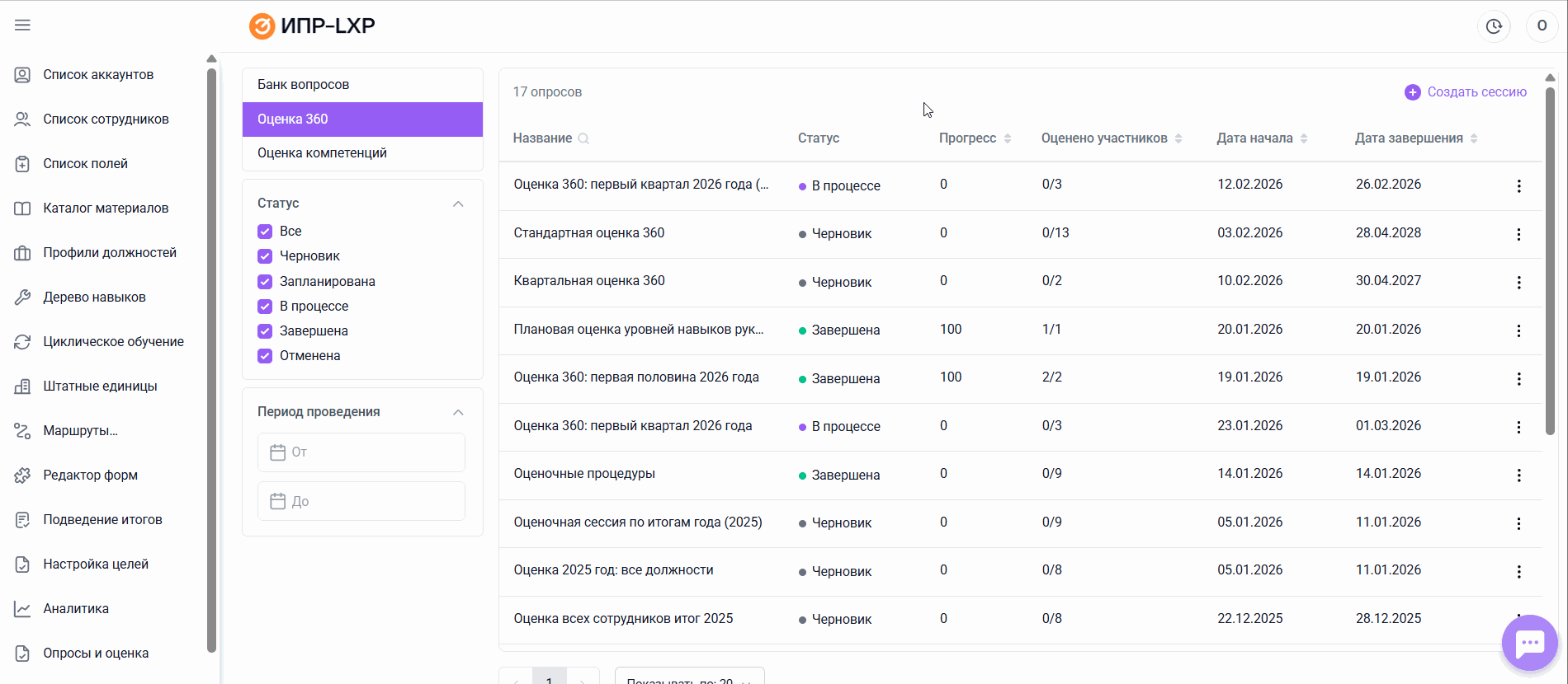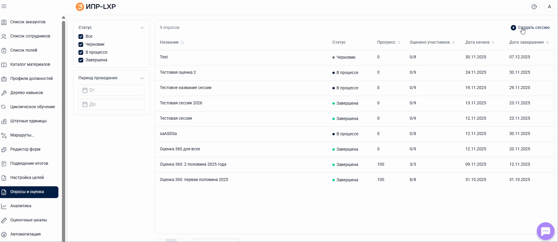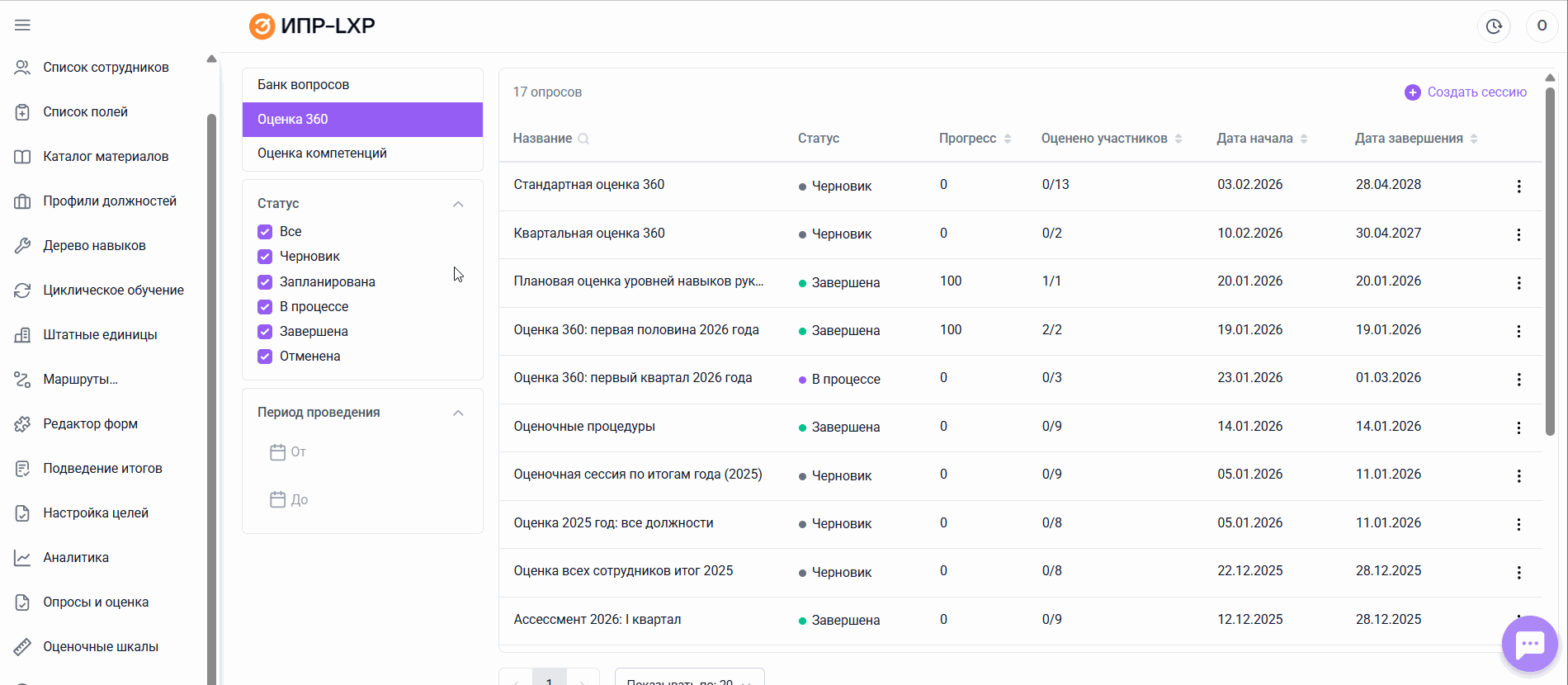 Слева от основной таблицы располагаются фильтры, позволяющие настроить ее отображение по статусу оценочной сессии и периоду ее проведения.