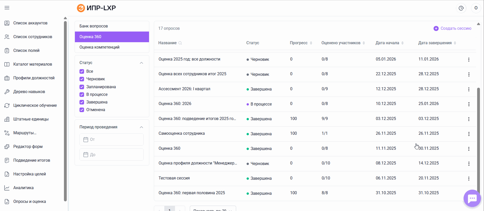 Создание сессии оценки 360°