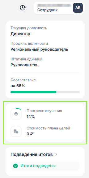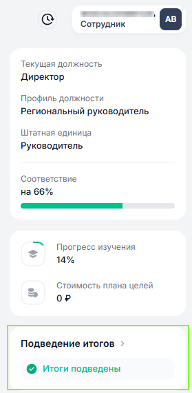 Виджет результатов «Подведение итогов» отображает статус процесса подведения итогов по ИПР самого сотрудника, если пользователь смотрит свой профиль, либо по подчиненному сотруднику. По нажатию на блок происходит переход к форме оценки.