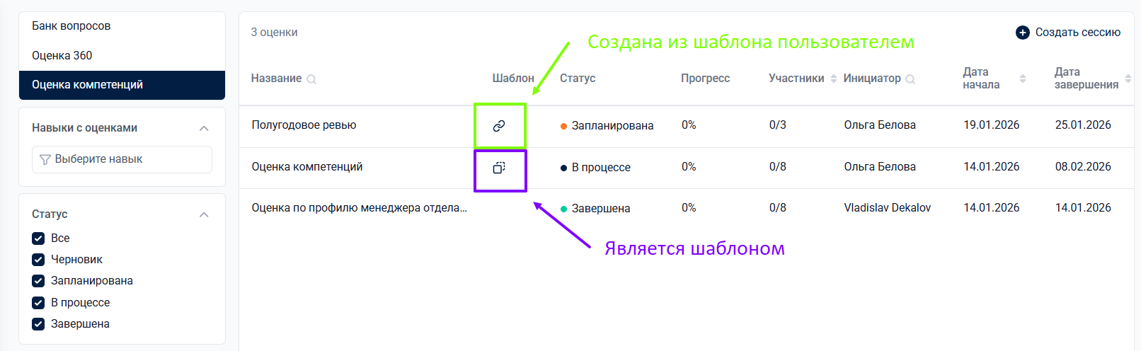Шаблон - позволяет администратору отслеживать, какие оценочные сессии могут быть использованы в пользовательской версии для создания новых оценок сотрудников, а также видеть, какие сессии уже были созданы на основе этих шаблонов;