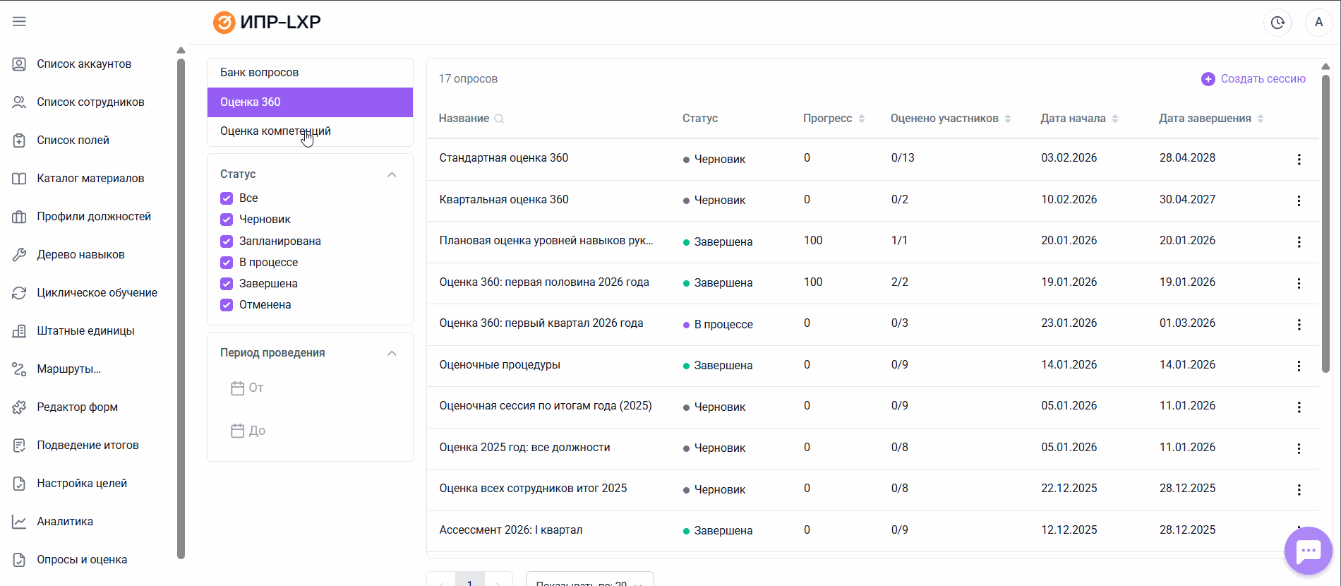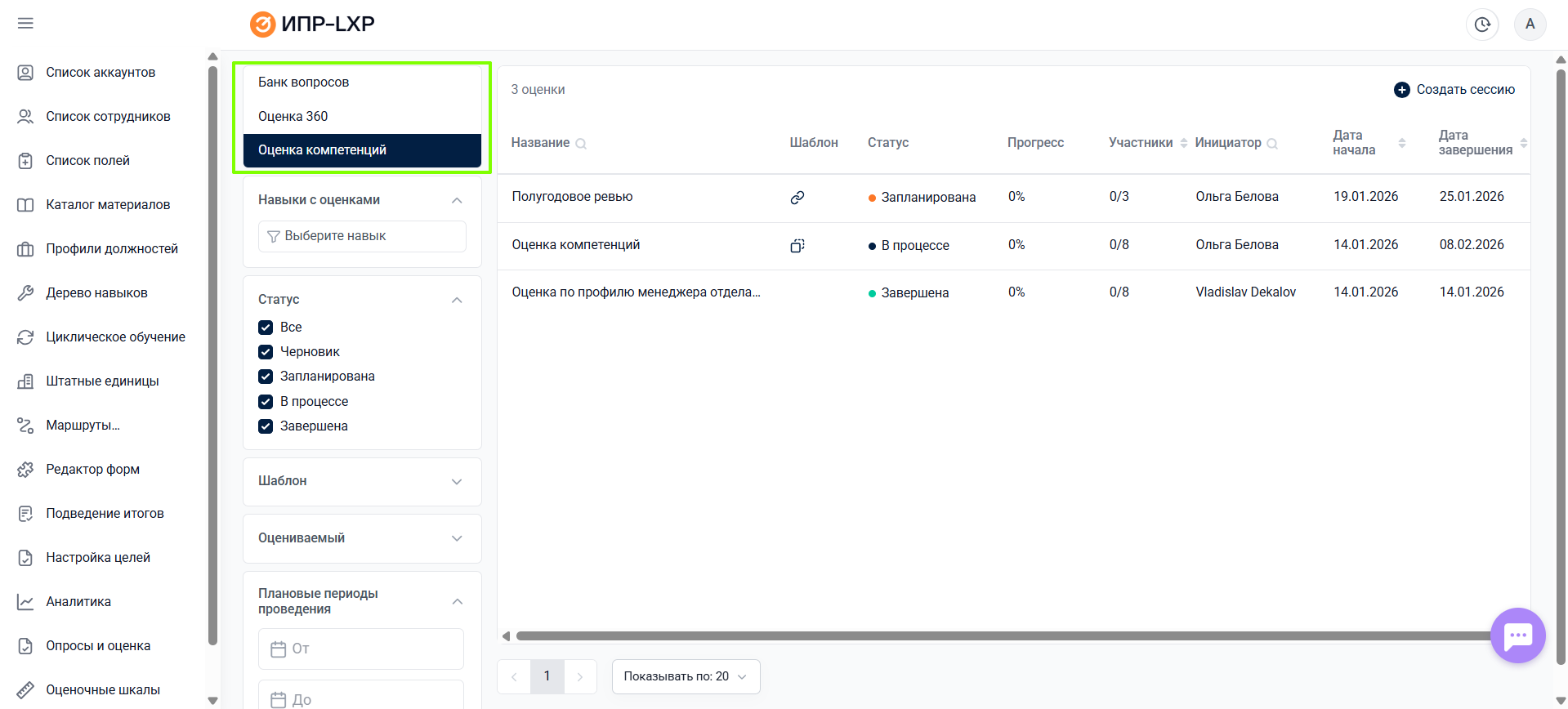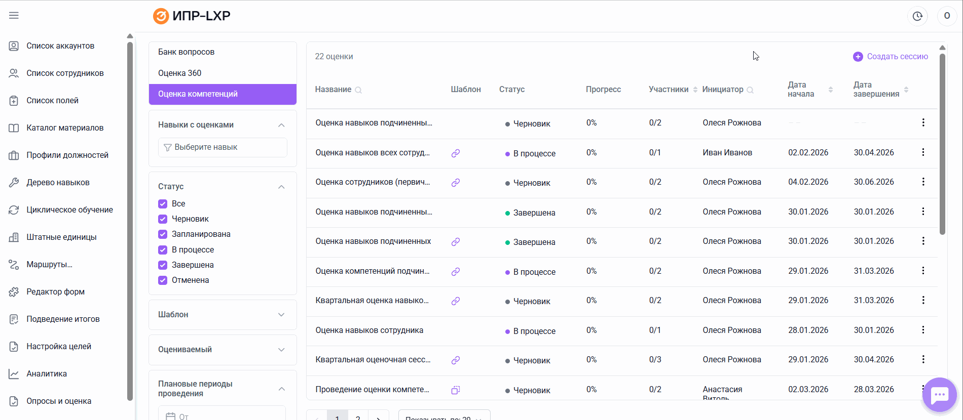 Рассмотрим основные параметры и этапы работы с сессиями оценки компетенций: порядок их создания, настройки и запуска.