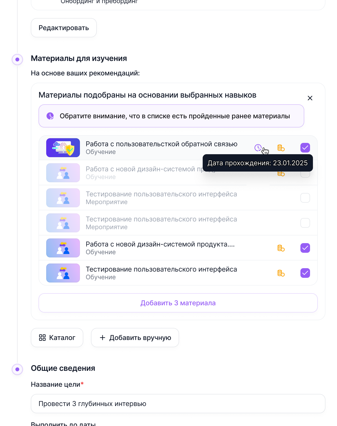 При добавлении навыков автоматически подтягиваются материалы, связанные с ними в следующем блоке Материалы для изучения, а также отображаются сведения о его изучении пользователем в прошлом.