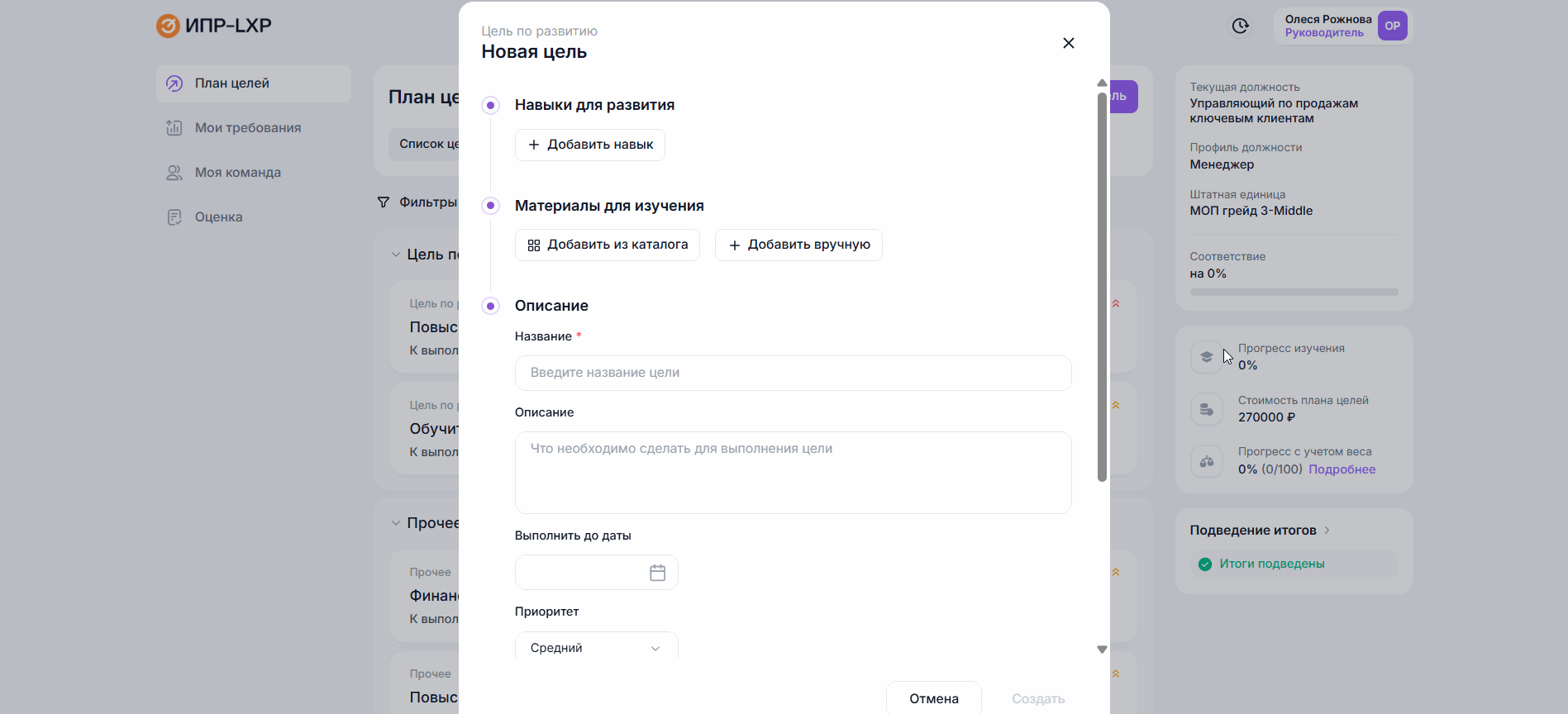 Добавление цели в пользовательской версии ИПР